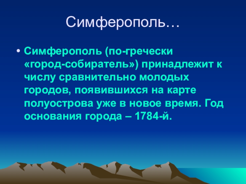Симферополь…Симферополь (по-гречески «город-cобиратель») принадлежит к числу сравнительно молодых городов, появившихся на карте полуострова уже в новое время. Год основания города – 1784-й.