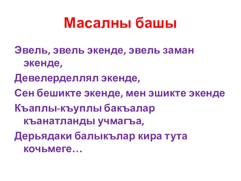 Масалны башыЭвель, эвель экенде, эвель заман экенде, Девелерделлял экенде,Сен бешикте экенде, мен эшикте экенде Къаплы-къуплы бакъалар къанатланды