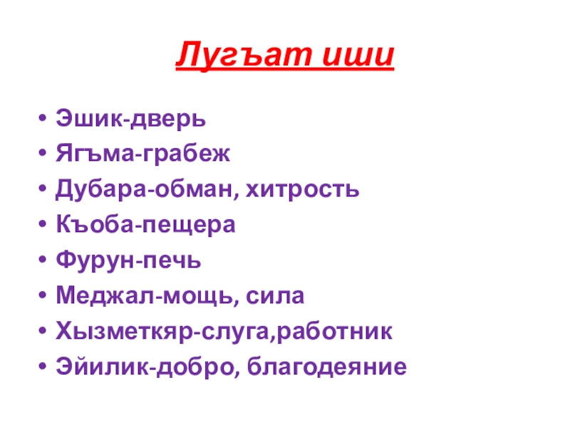 Лугъат ишиЭшик-дверьЯгъма-грабежДубара-обман, хитростьКъоба-пещераФурун-печьМеджал-мощь, силаХызметкяр-слуга,работникЭйилик-добро, благодеяние