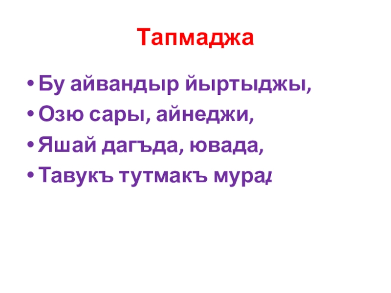 ТапмаджаБу айвандыр йыртыджы,Озю сары, айнеджи,Яшай дагъда, ювада,Тавукъ тутмакъ мурады.