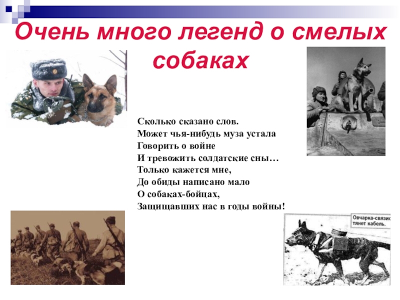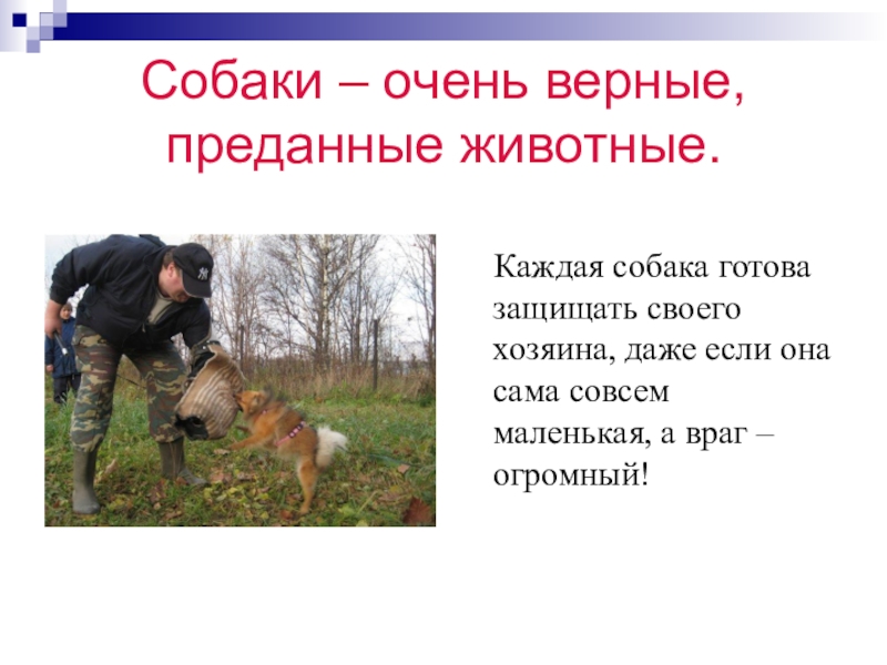 друг человека. Это повелось давно, еще с древних времён. Собаки стали помогать человеку много тысяч лет назад. С давних времен они служат человеку: охраняют его дом, сообщают о приходе гостя, помогают охотиться, пасут стада, спасают людей, ловят преступников.