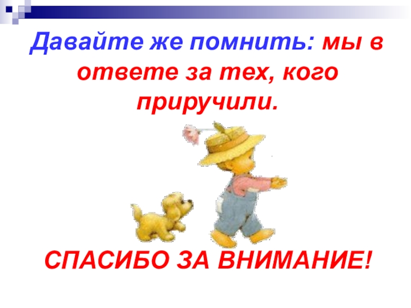 Слайд 21Давайте же помнить: мы в ответе за тех, кого приручили.