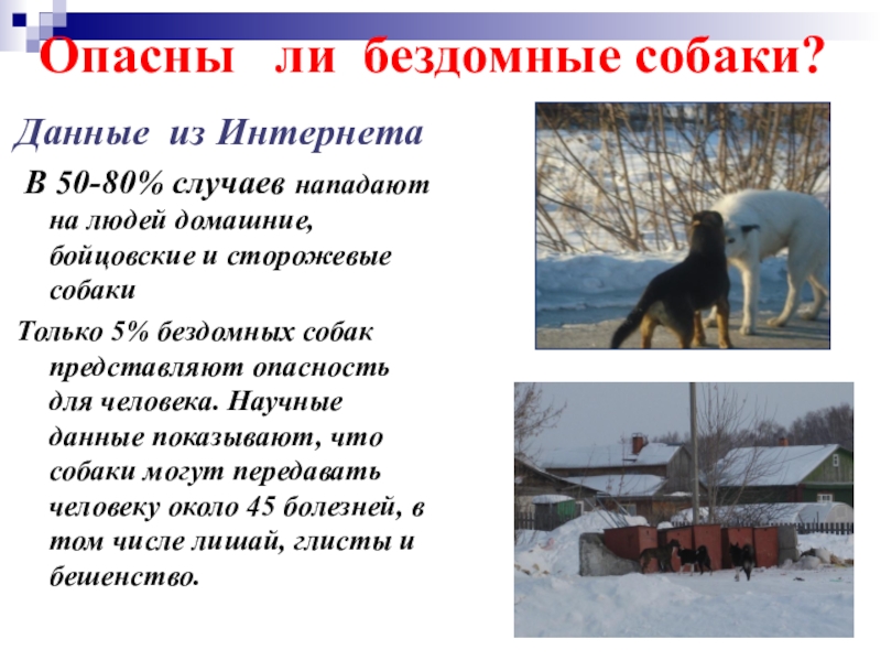 Только 5% бездомных собак представляют опасность для человека. Научные данные показывают, что собаки могут передавать человеку около 45 болезней, в том числе лишай, глисты и бешенство.
