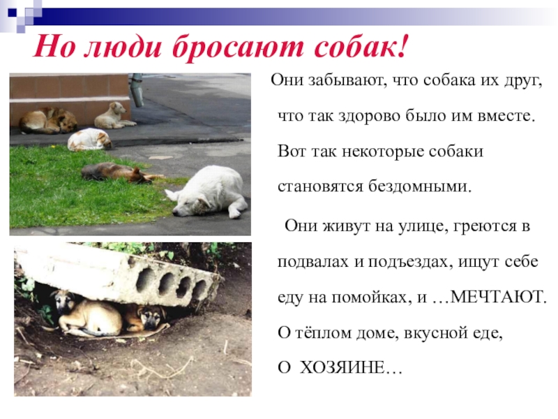Они живут на улице, греются в подвалах и подъездах, ищут себе еду на помойках, и …МЕЧТАЮТ. О тёплом доме, вкусной еде, О ХОЗЯИНЕ…