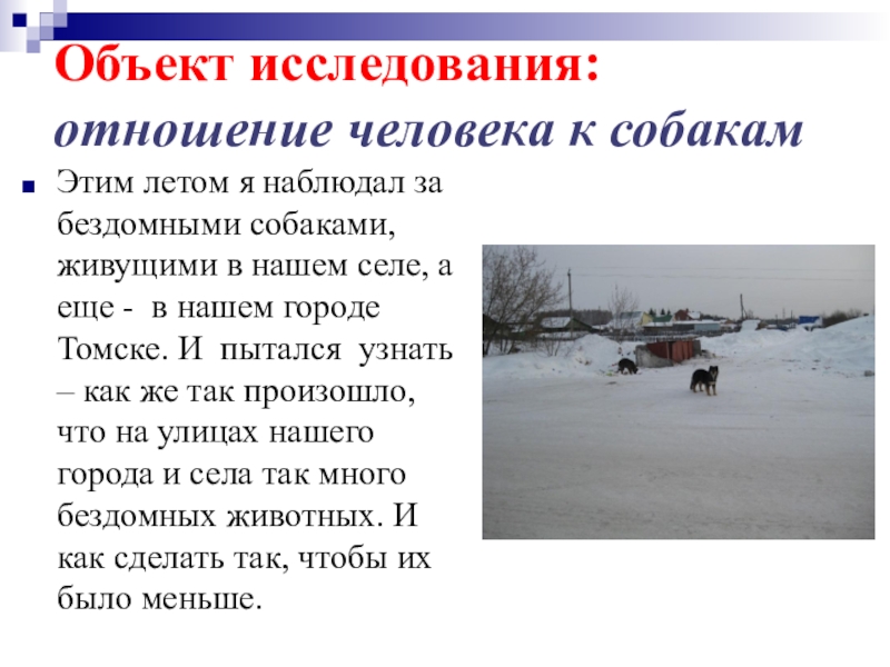 живущими в нашем селе, а еще - в нашем городе Томске. И пытался узнать – как же так произошло, что на улицах нашего города и села так много бездомных животных. И как сделать так, чтобы их было меньше.