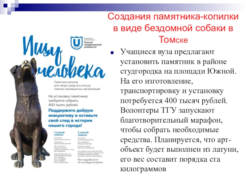 Слайд 19Создания памятника-копилки в виде бездомной собаки в Томске