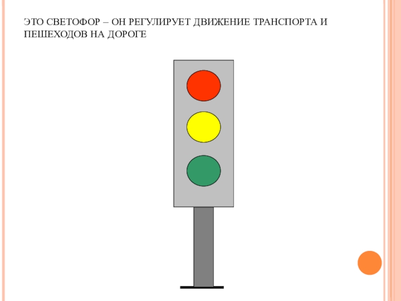 Слайд 5ЭТО СВЕТОФОР – ОН РЕГУЛИРУЕТ ДВИЖЕНИЕ ТРАНСПОРТА И ПЕШЕХОДОВ НА ДОРОГЕ