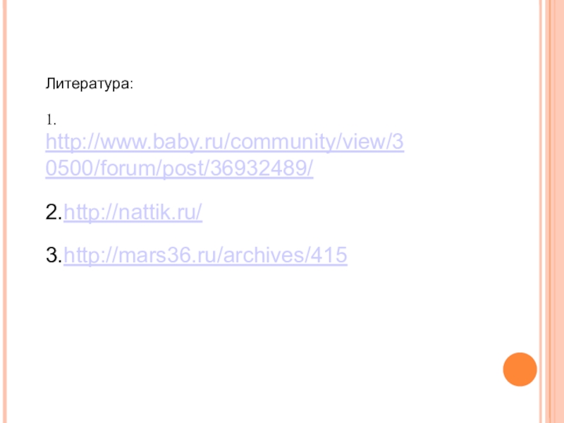 Литература:1. http://www.baby.ru/community/view/30500/forum/post/36932489/2.http://nattik.ru/3.http://mars36.ru/archives/415