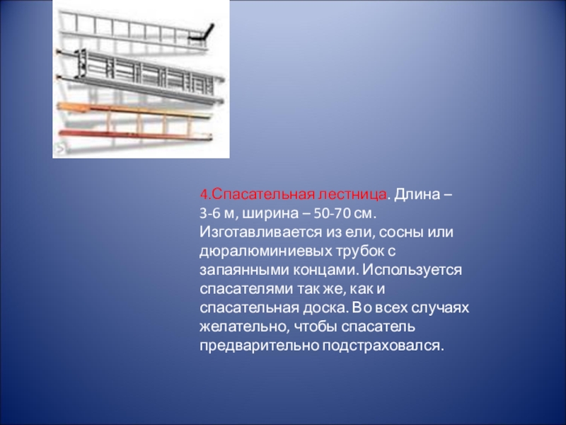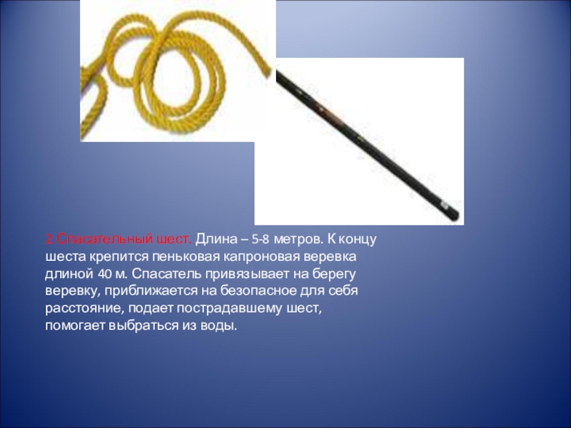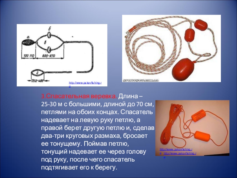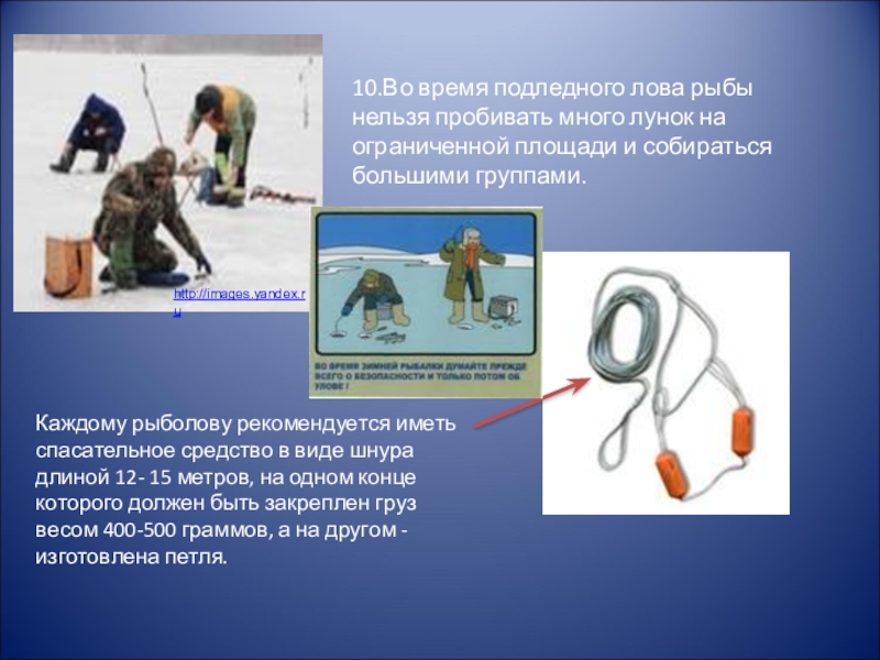 Каждому рыболову рекомендуется иметь спасательное средство в виде шнура длиной 12- 15 метров, на одном конце которого должен быть закреплен груз весом 400-500 граммов, а на другом - изготовлена петля.