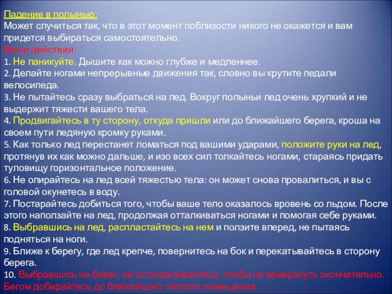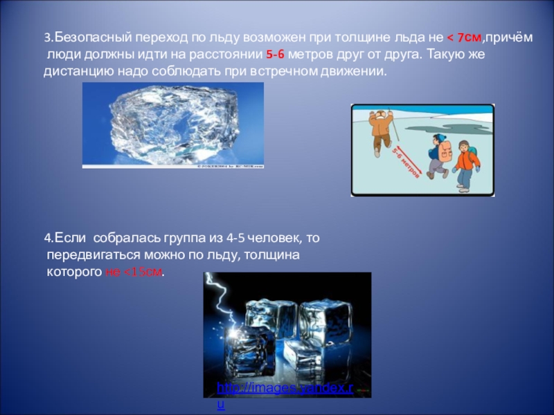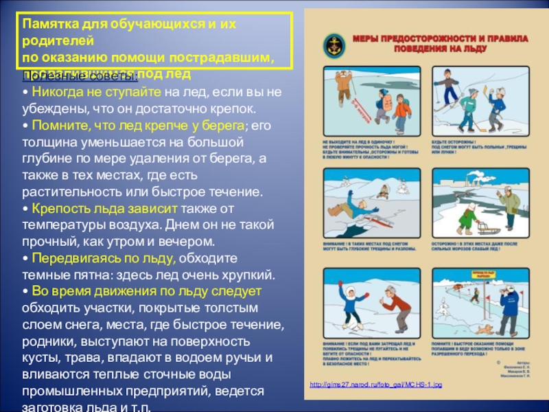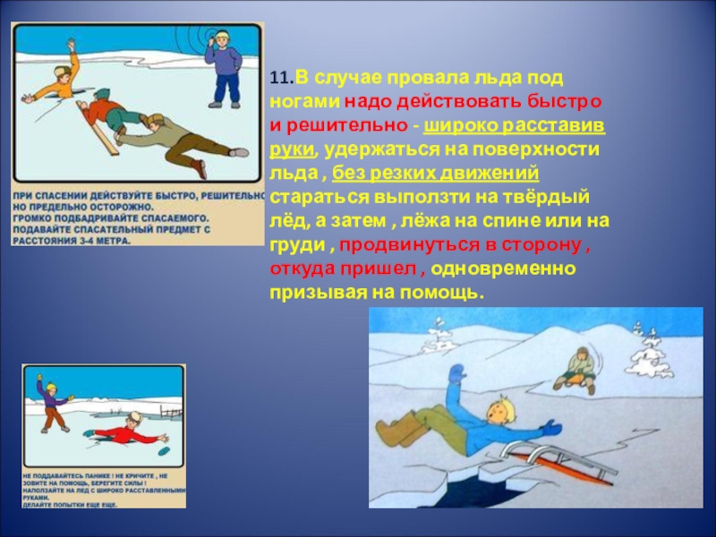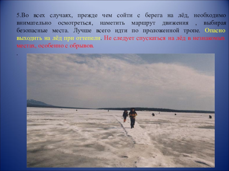 • Передвигаясь по льду, обходите темные пятна: здесь лед очень хрупкий.