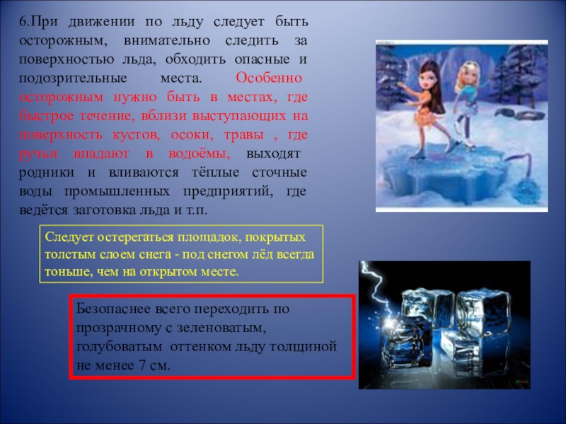 • Во время движения по льду следует обходить участки, покрытые толстым слоем снега, места, где быстрое течение, родники, выступают на поверхность кусты, трава, впадают в водоем ручьи и вливаются теплые сточные воды промышленных предприятий, ведется заготовка льда и т.п.