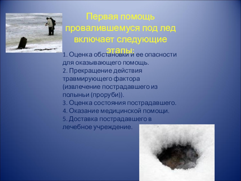 Первая помощь провалившемуся под лед включает следующие этапы: