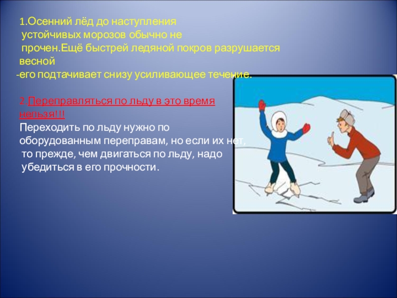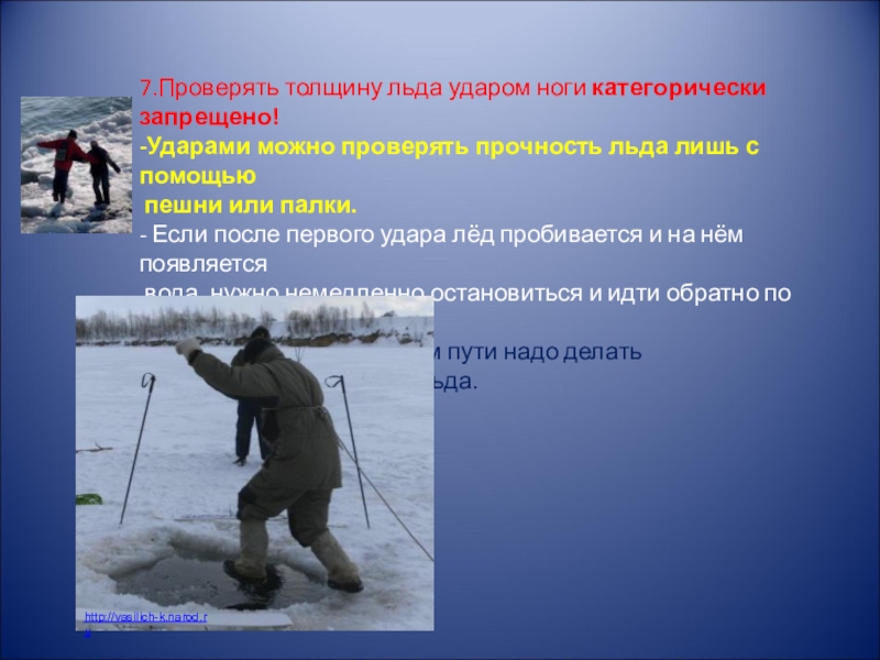 • Никогда не ступайте на лед, если вы не убеждены, что он достаточно крепок.
