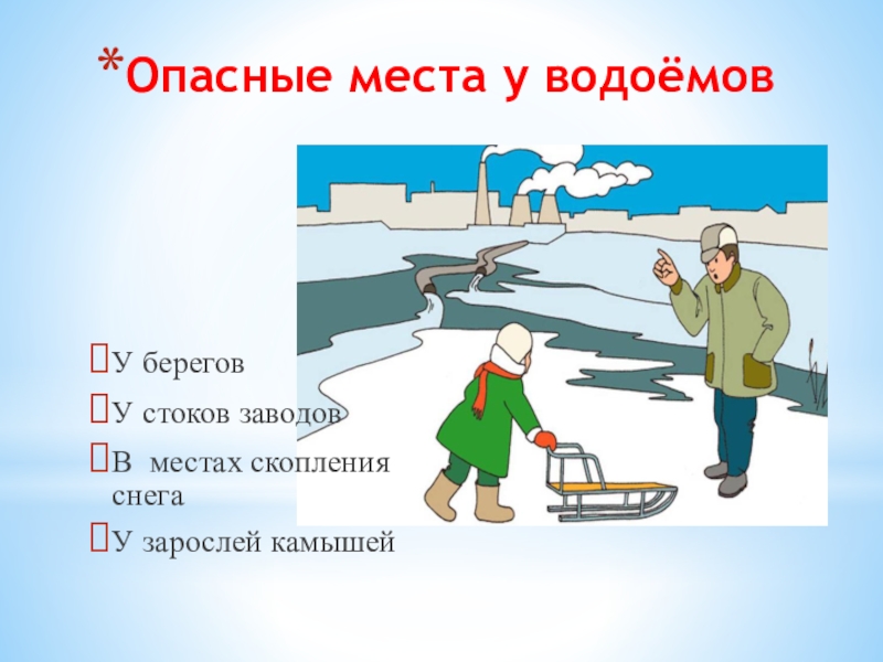 Опасные места у водоёмовУ береговУ стоков заводовВ местах скопления снегаУ зарослей камышей