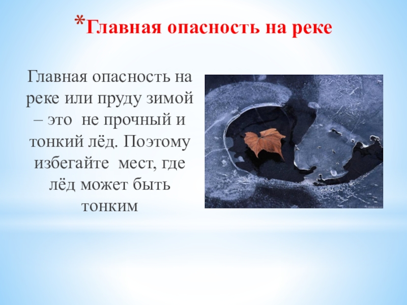 Главная опасность на рекеГлавная опасность на реке или пруду зимой – это не прочный и тонкий лёд. Поэтому избегайте мест, где лёд может быть тонким