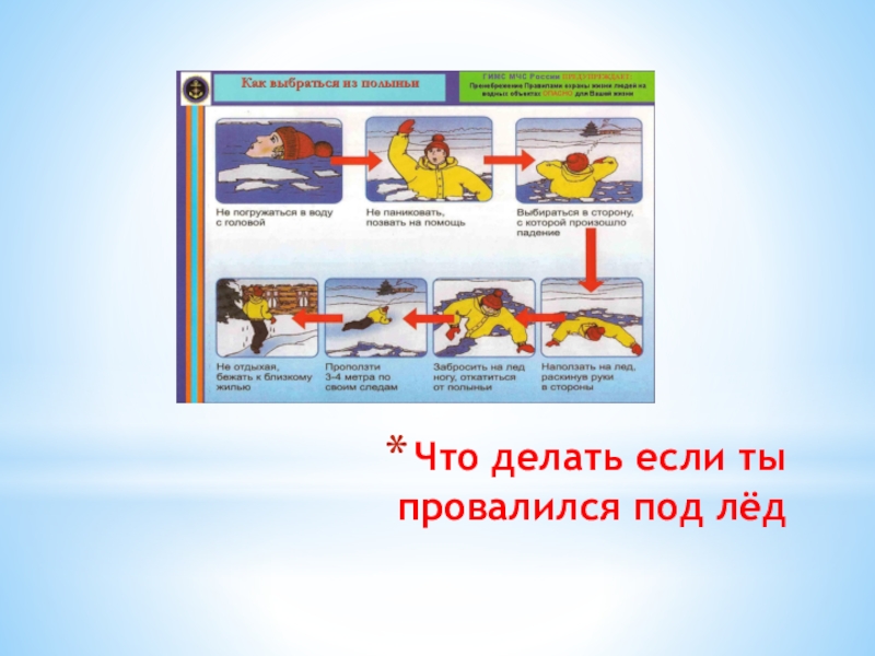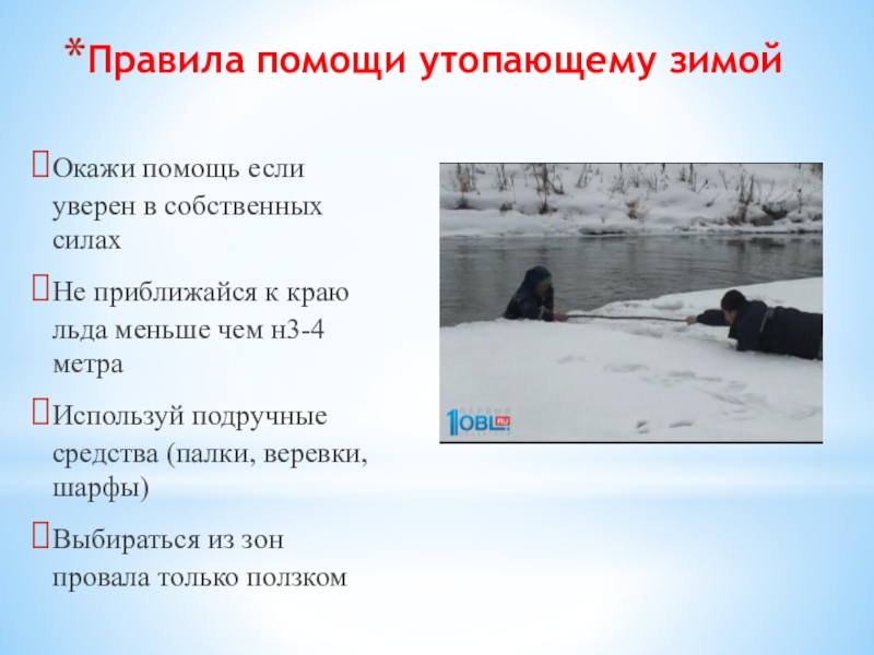 Правила помощи утопающему зимойОкажи помощь если уверен в собственных силахНе приближайся к краю льда меньше чем н3-4