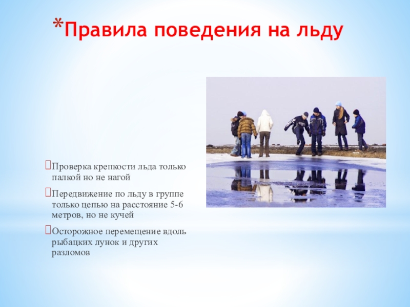 Правила поведения на льдуПроверка крепкости льда только палкой но не нагойПередвижение по льду в группе только цепью