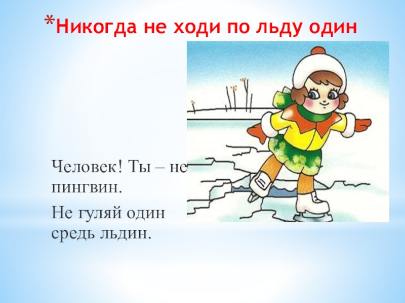 Никогда не ходи по льду одинЧеловек! Ты – не пингвин.Не гуляй один средь льдин.