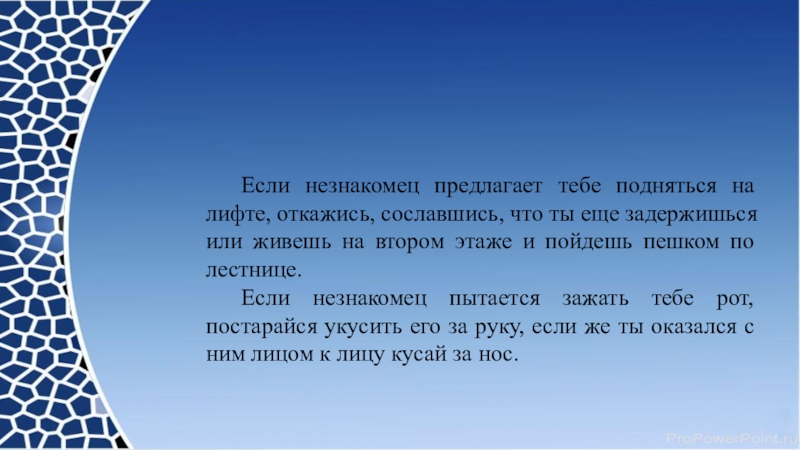 Слайд 28Если незнакомец предлагает тебе подняться на лифте, откажись, сославшись, что ты