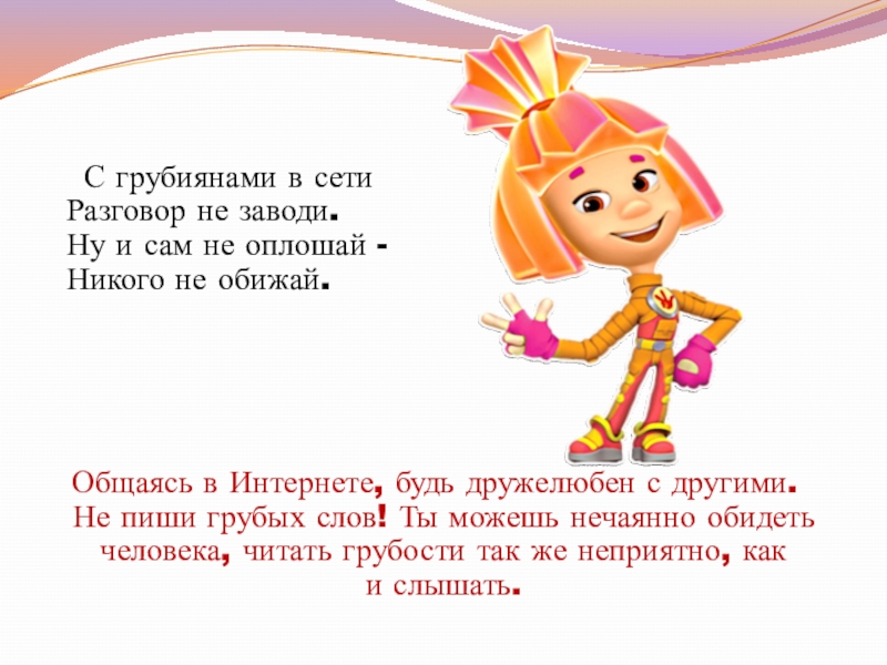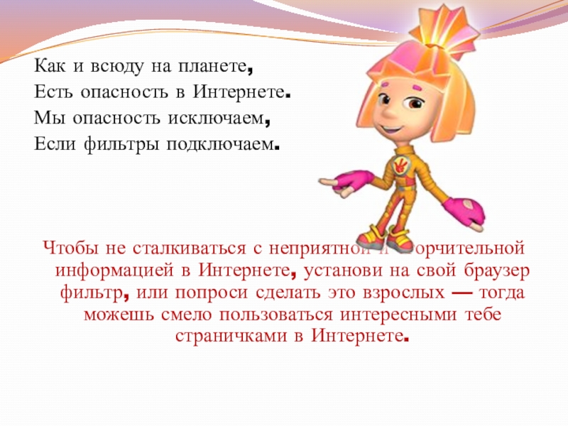 информацией в Интернете, установи на свой браузер фильтр, или попроси сделать это взрослых — тогда можешь смело пользоваться интересными тебе страничками в Интернете.