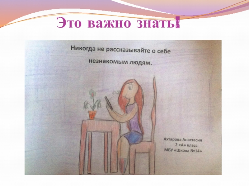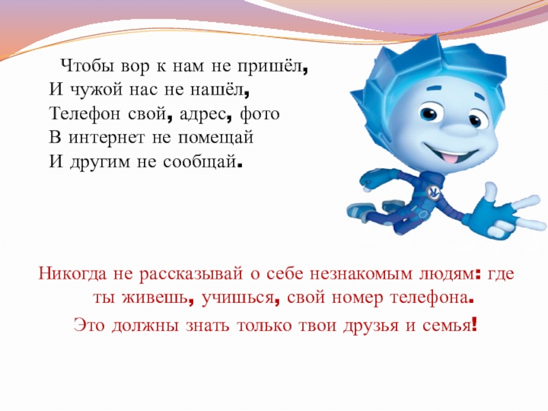 Никогда не рассказывай о себе незнакомым людям: где ты живешь, учишься, свой номер телефона.