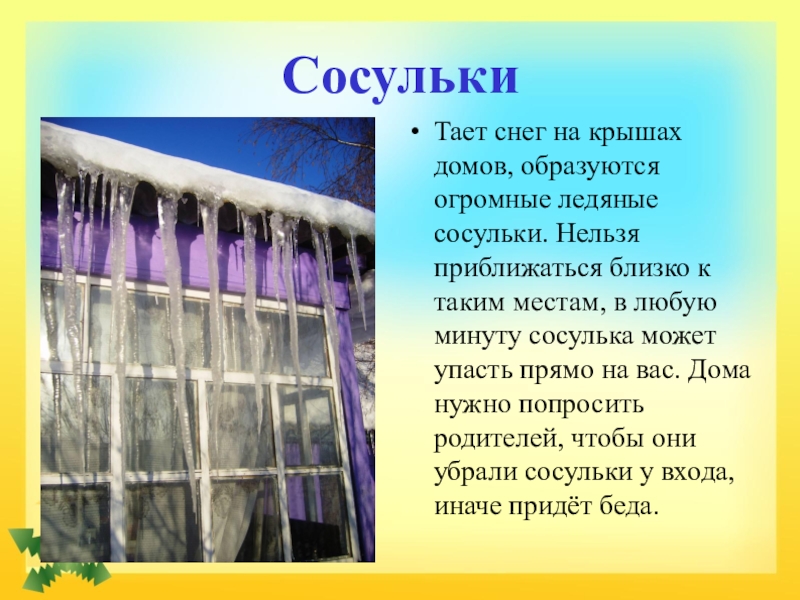 приближаться близко к таким местам, в любую минуту сосулька может упасть прямо на вас. Дома нужно попросить родителей, чтобы они убрали сосульки у входа, иначе придёт беда.