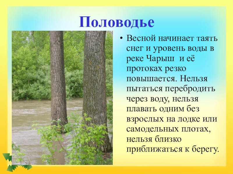 ПоловодьеВесной начинает таять снег и уровень воды в реке Чарыш и её протоках резко повышается. Нельзя пытаться