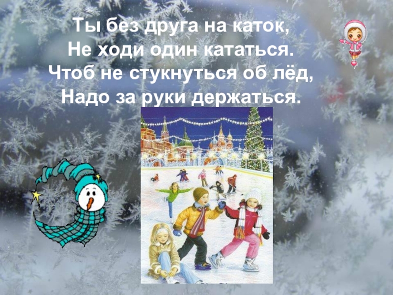 Ты без друга на каток,Не ходи один кататься.Чтоб не стукнуться об лёд,Надо за руки держаться.