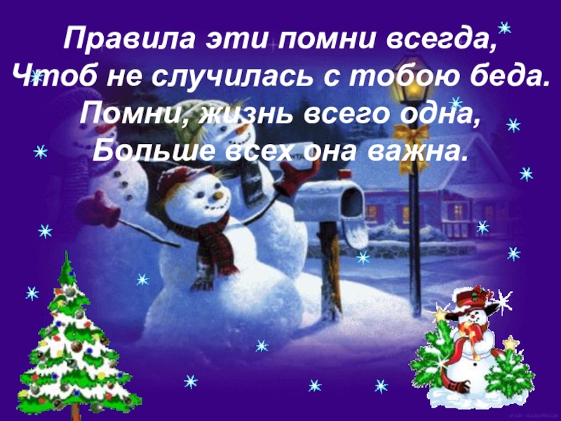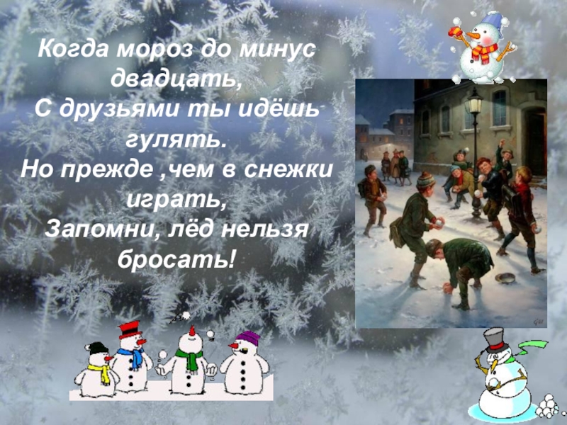 Когда мороз до минус двадцать,С друзьями ты идёшь гулять.Но прежде ,чем в снежки играть,Запомни, лёд нельзя бросать!