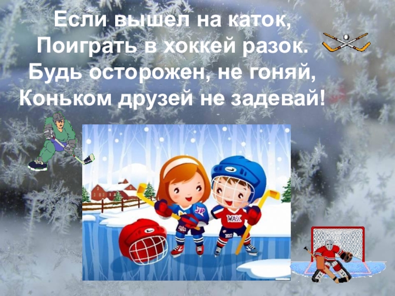 Если вышел на каток,Поиграть в хоккей разок. Будь осторожен, не гоняй,Коньком друзей не задевай!.