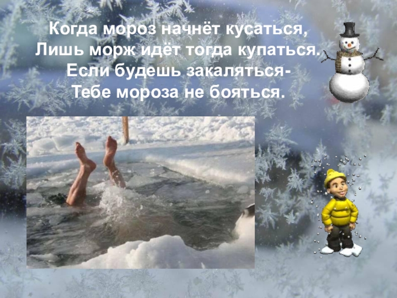 Когда мороз начнёт кусаться,Лишь морж идёт тогда купаться.Если будешь закаляться-Тебе мороза не бояться.