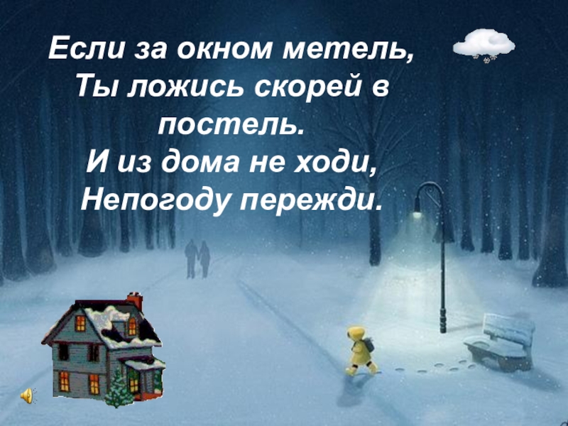 Если за окном метель,Ты ложись скорей в постель.И из дома не ходи,Непогоду пережди.