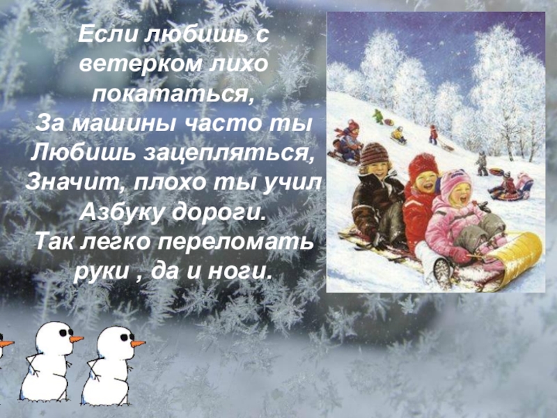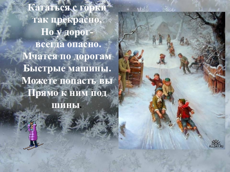Кататься с горки  так прекрасно, Но у дорог-  всегда опасно.  Мчатся по