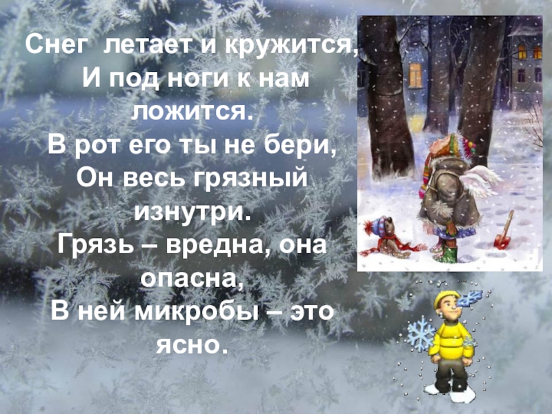Снег летает и кружится, И под ноги к нам ложится.В рот его ты не бери,Он весь грязный