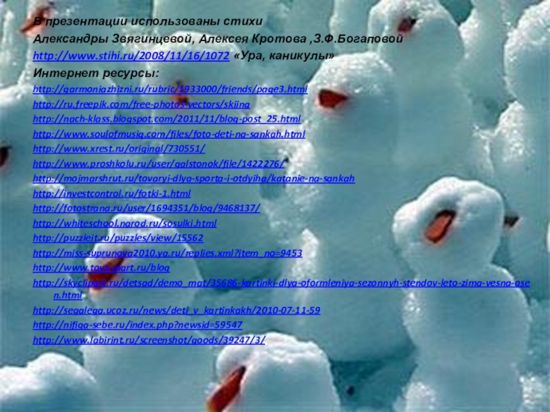 В презентации использованы стихи Александры Звягинцевой, Алексея Кротова ,З.Ф.Богаповойhttp://www.stihi.ru/2008/11/16/1072 «Ура, каникулы»Интернет ресурсы:http://garmoniazhizni.ru/rubric/1933000/friends/page3.htmlhttp://ru.freepik.com/free-photos-vectors/skiinghttp://nach-klass.blogspot.com/2011/11/blog-post_25.htmlhttp://www.soulofmusiq.com/files/foto-deti-na-sankah.htmlhttp://www.xrest.ru/original/730551/http://www.proshkolu.ru/user/galstonok/file/1422276/http://mojmarshrut.ru/tovaryi-dlya-sporta-i-otdyiha/katanie-na-sankahhttp://investcontrol.ru/fotki-1.htmlhttp://fotostrana.ru/user/1694351/blog/9468137/http://whiteschool.narod.ru/sosulki.htmlhttp://puzzleit.ru/puzzles/view/15562http://miss-suprunova2010.ya.ru/replies.xml?item_no=9453http://www.toys-mart.ru/bloghttp://skyclipart.ru/detsad/demo_mat/35686-kartinki-dlya-oformleniya-sezonnyh-stendov-leto-zima-vesna-osen.htmlhttp://segalega.ucoz.ru/news/deti_v_kartinkakh/2010-07-11-59http://nifiga-sebe.ru/index.php?newsid=59547http://www.labirint.ru/screenshot/goods/39247/3/
