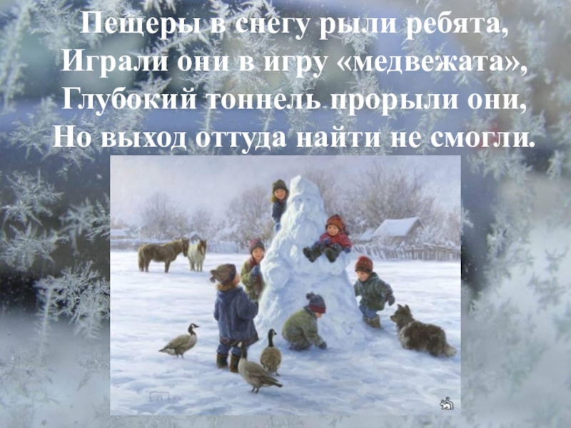Пещеры в снегу рыли ребята,Играли они в игру «медвежата»,Глубокий тоннель прорыли они,Но выход оттуда найти не смогли.