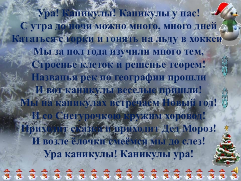 Ура! Каникулы! Каникулы у нас!С утра до ночи можно много, много днейКататься с горки и гонять на льду в хоккей!Мы за пол года изучили много тем,Строенье клеток и решенье теорем!Названья рек по географии прошлиИ вот каникулы