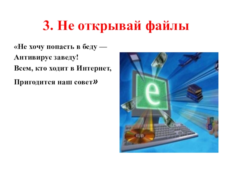 3. Не открывай файлы«Не хочу попасть в беду —Антивирус заведу!Всем, кто ходит в Интернет,Пригодится наш совет»