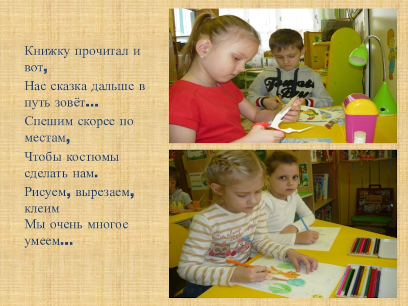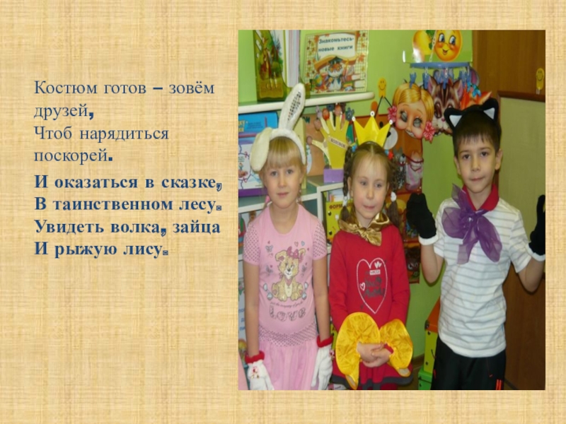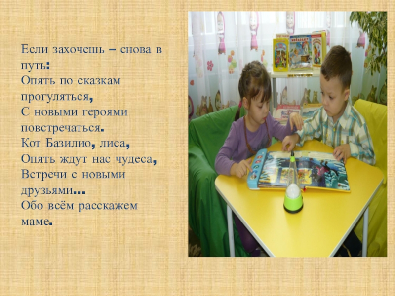 Опять по сказкам прогуляться, С новыми героями повстречаться. Кот Базилио, лиса, Опять ждут нас чудеса, Встречи с новыми друзьями… Обо всём расскажем маме.