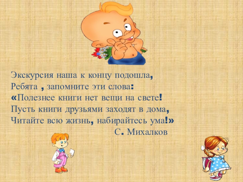Ребята , запомните эти слова: «Полезнее книги нет вещи на свете! Пусть книги друзьями заходят в дома, Читайте всю жизнь, набирайтесь ума!»