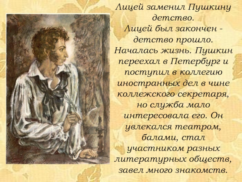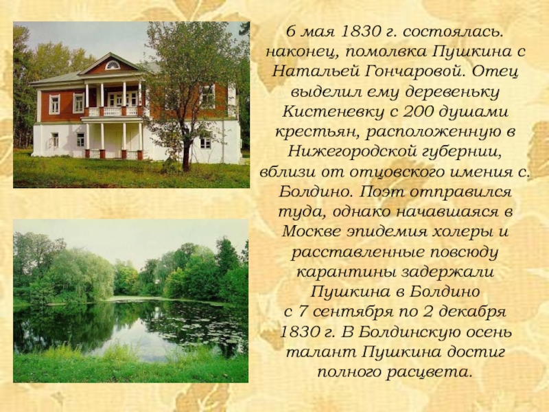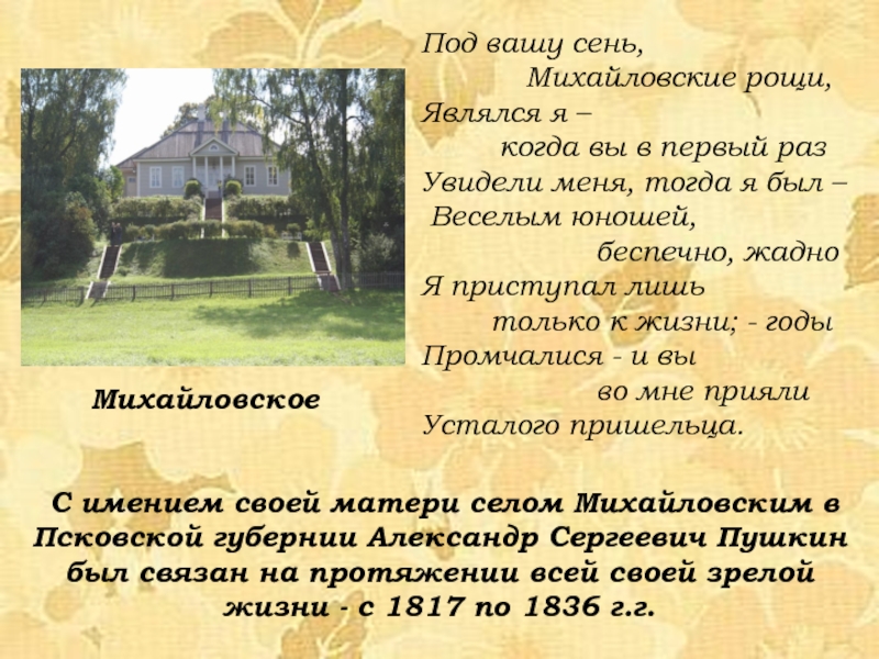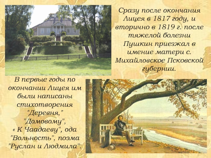 Сразу после окончания Лицея в 1817 году, и вторично в 1819 г. после тяжелой болезни Пушкин приезжал в имение матери с.Михайловское Псковской губернии.