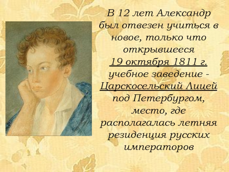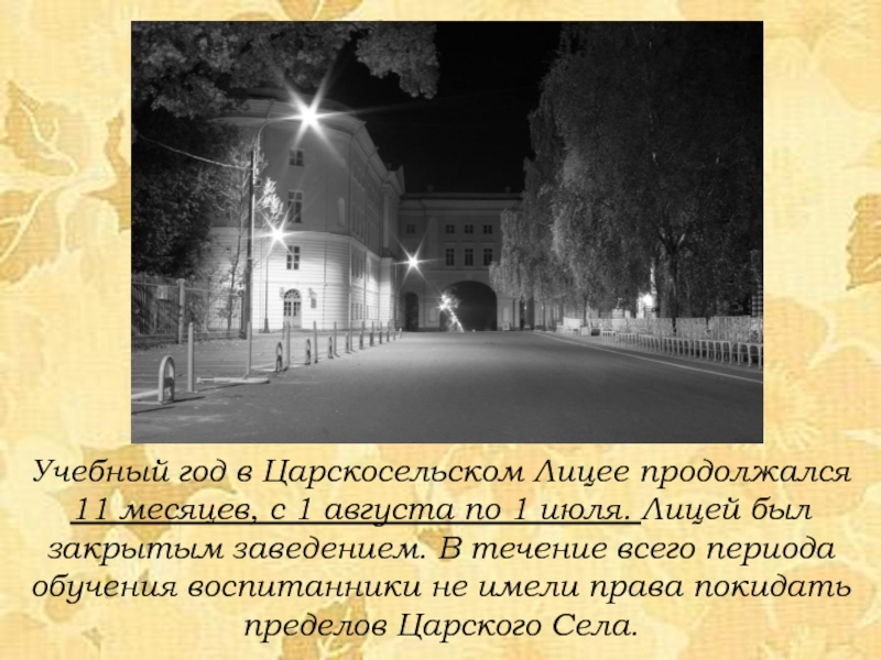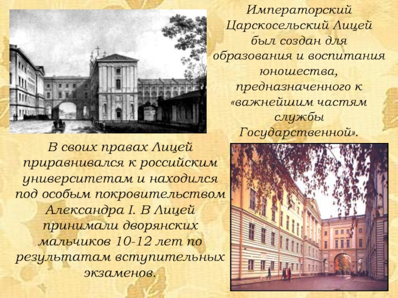 В своих правах Лицей приравнивался к российским университетам и находился под особым покровительством Александра I. В Лицей принимали дворянских мальчиков 10-12 лет по результатам вступительных экзаменов.