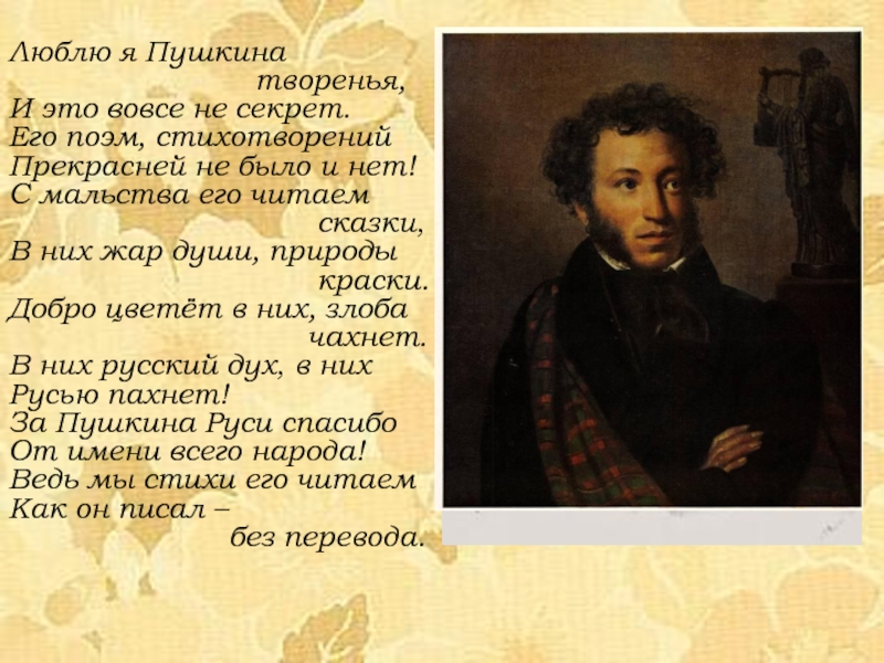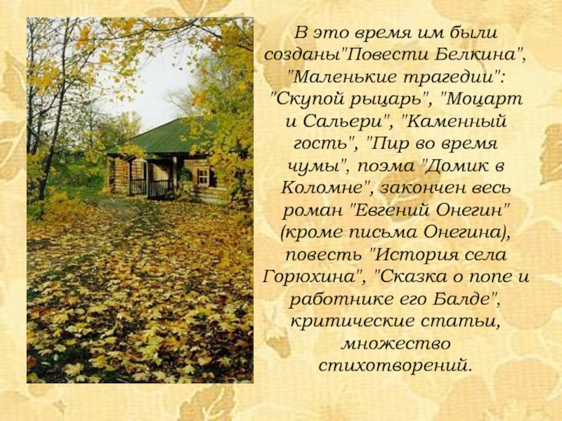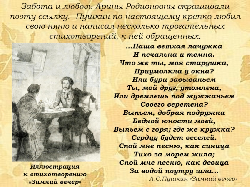 А вечерами, когда за окном выла вьюга, он снова, как в детстве, слушал нянины сказки и песни. Вот как поэт писал брату в письме: «Знаешь ли мои занятия? До обеда пишу записки, после обеда езжу верхом, вечером слушаю сказки… Что за прелесть эти сказки! Каждая из них поэма!»