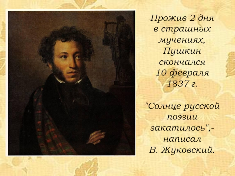 8 февраля 1837 года, в 5-м часу вечера, на Черной речке в Петербурге состоялась роковая дуэль, на которой Пушкин был смертельно ранен.
