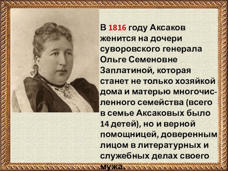 Слайд 9В 1816 году Аксаков женится на дочери суворовского генерала Ольге Семеновне