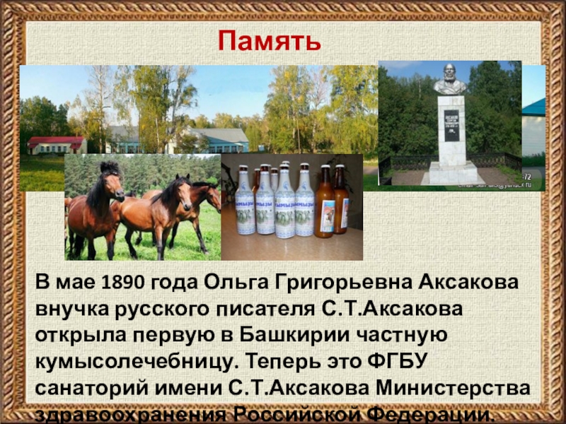 открыла первую в Башкирии частную кумысолечебницу. Теперь это ФГБУ санаторий имени С.Т.Аксакова Министерства здравоохранения Российской Федерации.