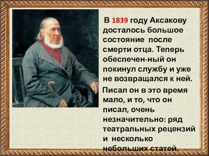 Слайд 14 В 1839 году Аксакову досталось большое состояние после смерти