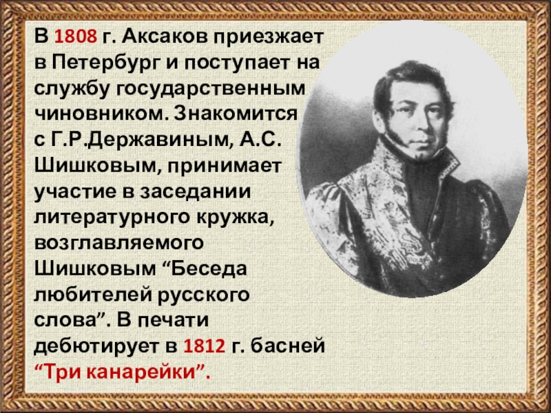 Слайд 7В 1808 г. Аксаков приезжает в Петербург и поступает на службу
