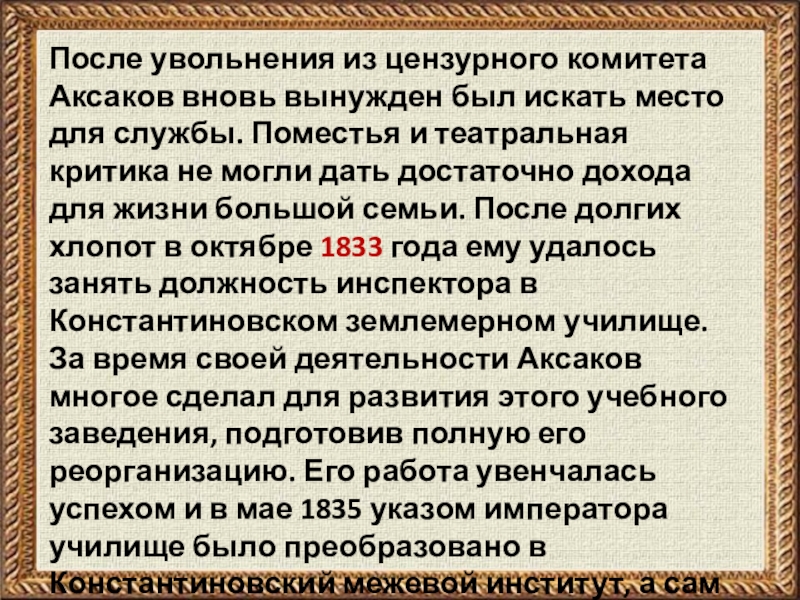 для службы. Поместья и театральная критика не могли дать достаточно дохода для жизни большой семьи. После долгих хлопот в октябре 1833 года ему удалось занять должность инспектора в Константиновском землемерном училище. За время своей деятельности Аксаков многое сделал для развития этого учебного заведения, подготовив полную его реорганизацию. Его работа увенчалась успехом и в мае 1835 указом императора училище было преобразовано в Константиновский межевой институт, а сам Аксаков назначен был его директором.