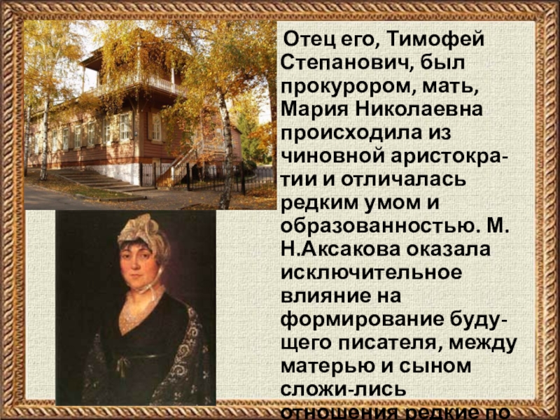 происходила из чиновной аристокра-тии и отличалась редким умом и образованностью. М.Н.Аксакова оказала исключительное влияние на формирование буду-щего писателя, между матерью и сыном сложи-лись отношения редкие по доверительности и дружелюбию.